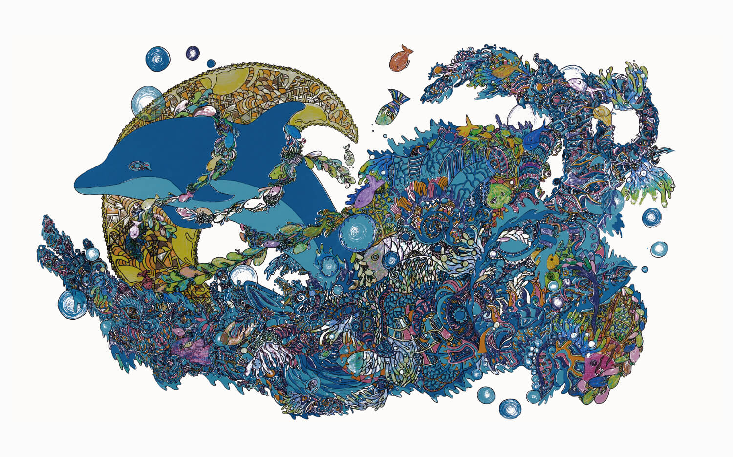 - 技法は版画のシルクスクリーンです。色ごとに製版して孔版インクとクレヨンで刷りました。この絵を描こうと思ったのは学校最後の作品になると思い、いつも描いている細かい線で、その時想像したもの、好きなイルカや生き物などを大きい画面に描きました。魚がたくさん隠れています。この絵を見てくれた人が自分とは違う想像をして何かを感じてくれたら嬉しいです。