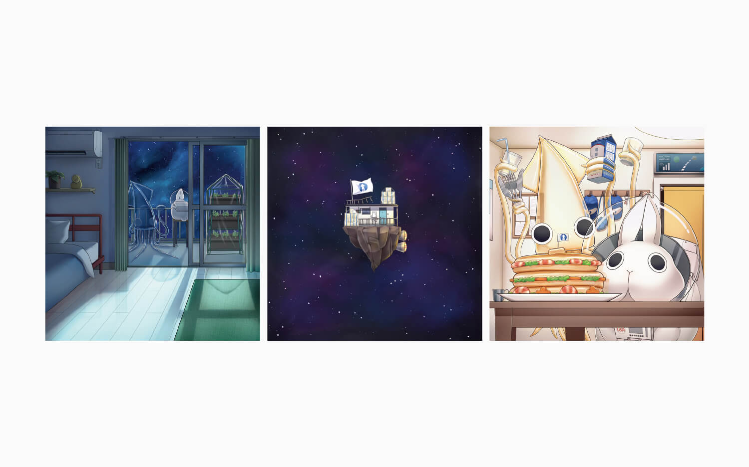 - テーマは日常です。このテーマにした理由は、自身の身近なものを描きたいと思い、日常が一番身近にあると感じたからです。同時に他人の日常が一番遠いものであるとも考え、地球から遠く離れた宇宙での日常を描きました。うさぎとイカにしたのは、うさぎは家で飼っているから、イカは宇宙人っぽさを感じたからです。その2人の生活がくり返されているイメージを、時計回りにイラストを配置することで表しました。