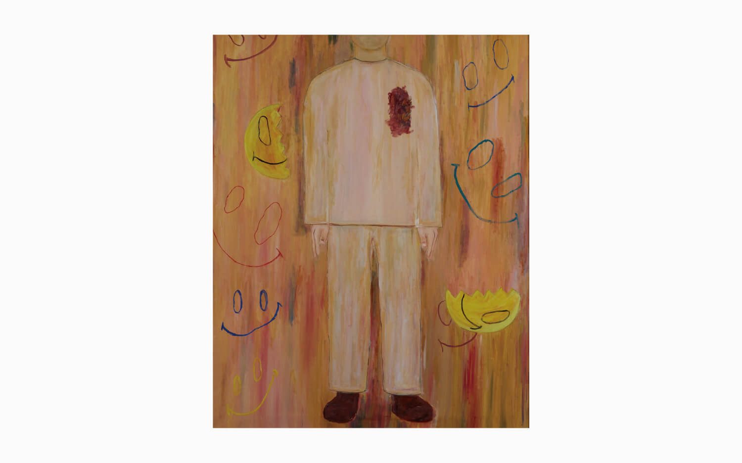 - 内面の感情をテーマにした作品を制作しました。誰もが自分の感情を偽り、辛く悲しい経験があると思います。自分自身、とても感情を表に出すのが苦手で、自分って何だろう?自分はどんな顔をしているのだろう?と考えました。自分の考える偽りとは笑いだと思いました。本当に心の底から笑えているのか?笑顔の裏にはどんな感情があるのか考えてみるきっかけにしたいです。