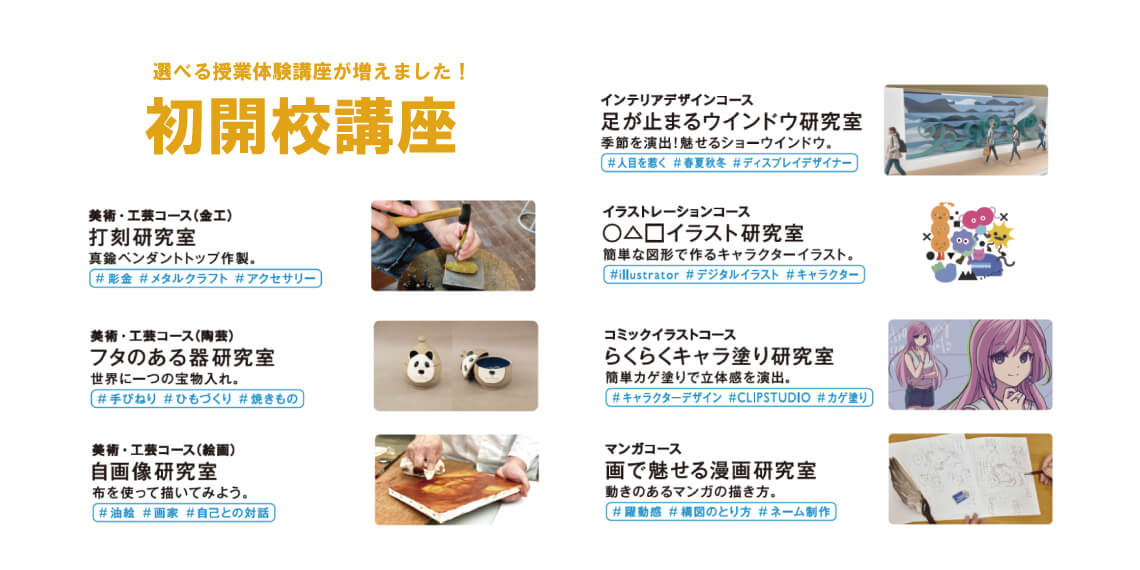 他にも授業料全額免除入学試験の試験科目でもある「鉛筆デッサン」を基礎から学べる講座、毎回好評の校長三木健「特別講演」や「学校・入試説明会」、「個別相談ブース」もあります。